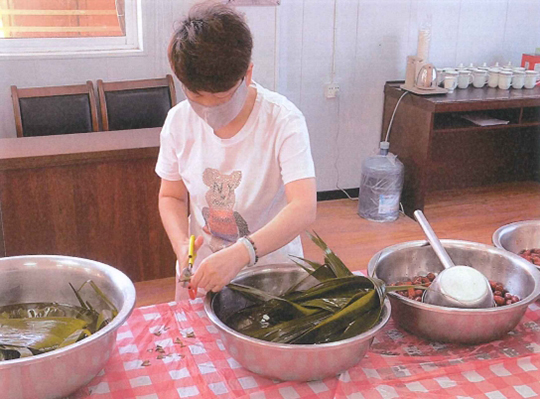 活動中,項目部工作人員把包粽子所需的粽葉、粽線、江米、紅棗等材料都提前準備好,大家圍在一起熱情忙碌著他們個個手法嫻熟、心靈手巧,挑選好粽葉后,折疊粽葉,投放糯米、添加餡料、一圈一繞捆綁著粽子,不一會兒一個個形態(tài)各異的三角粽逐漸成型。